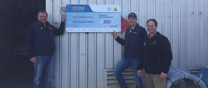 The cheque was proudly presented to school representative Janette Hindmarsh by Glen Bergersen from Bayer and Tom McInerney and Sacha Williams from Primaries. Sacha said “We receive a lot of support from the Borden community, so it’s nice to give something back through the iGiveLocal program. This donation will be a big help for the school of 22 students, as fundraising for this type of donation can be quite difficult and time consuming. The school intends to put the money towards computer technology for student use.”