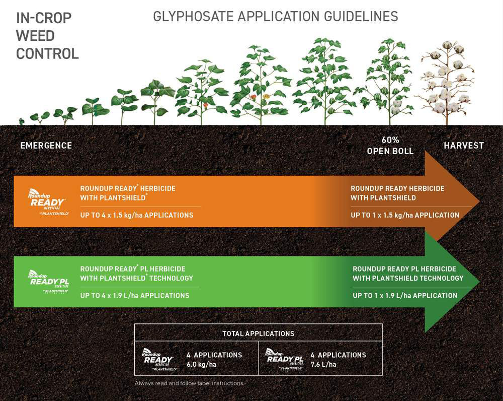 Roundup Ready PL® Herbicide with PLANTSHIELD® Technology and Roundup Ready Herbicide with PLANTSHIELD® are specifically designed to control annual and perennial weed types before and after sowing cotton crop containing the Roundup Ready Flex train. Proprietary surfactant and PLANTSHIELD technology provide superior weed control to enable growers to maximise yield potential. The Roundup Ready Herbicide range of products are the only registered over-the-top glyphosate formulations that come with the Bayer crop safety warranty.